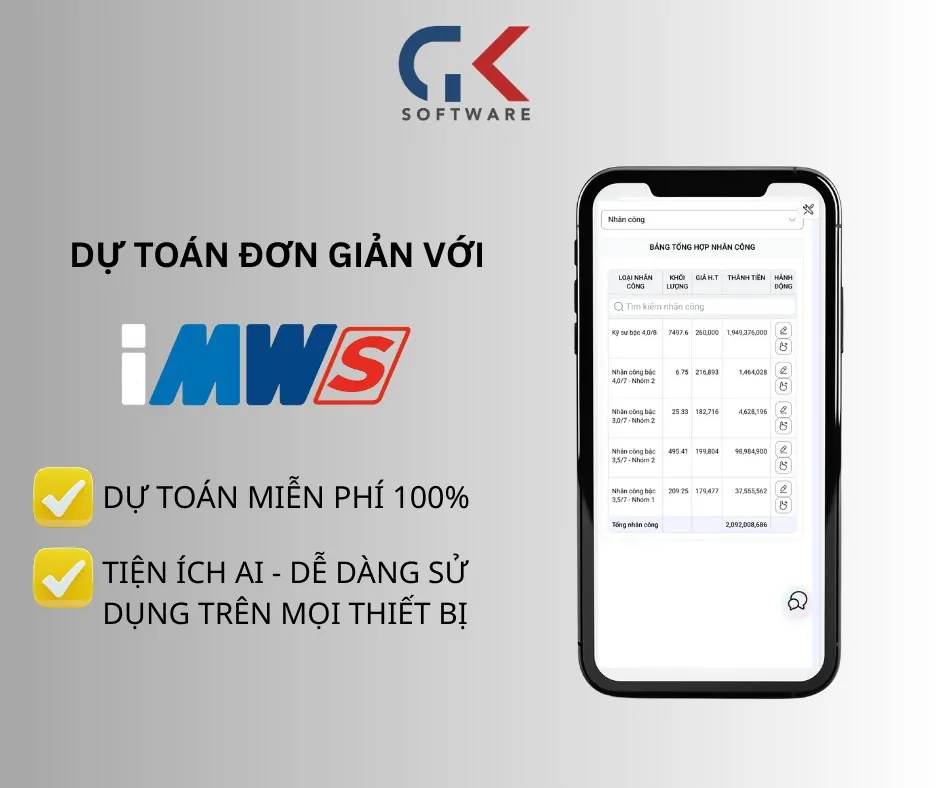 Dự toán IMWS là phần mềm dự toán xây dựng hoạt động trên nền tảng web, cho phép người dùng lập dự toán trực tuyến nhanh chóng mà không cần cài đặt. Đặc biệt, phần mềm được tích hợp trí tuệ nhân tạo (AI) giúp tự động hóa nhiều công đoạn trong quá trình lập dự toán.